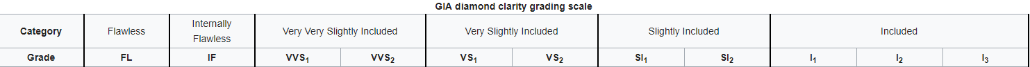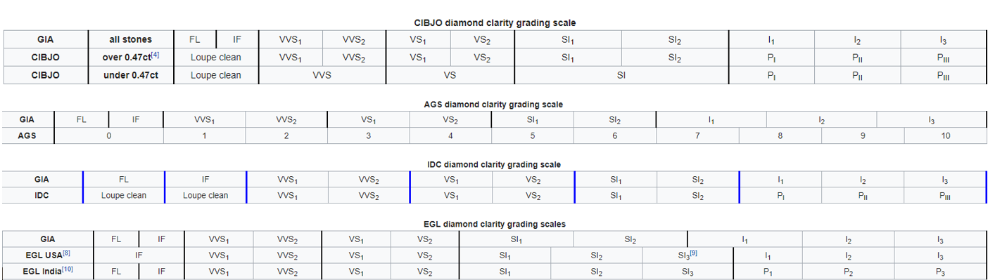 Poniższe tabele przedstawiają podobieństwa i różnice pomiędzy skalami klasyfikacji czystości diamentów.