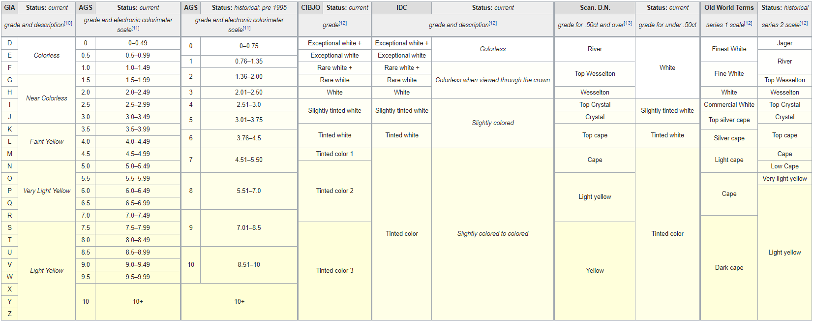 Przedstawiona poniżej tabela pokazuje różnice w sposobie klasyfikacji barwy diamentów w różnych systemach.
