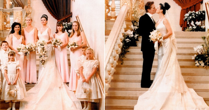 Znana ze srebrnego ekranu aktorka Catherine Zeta-Jones poślubiając Michaela Douglasa miała na sobie suknię wartą 140000 $US projektu Christiana Lacroix, oczywiście zdobioną diamentami.