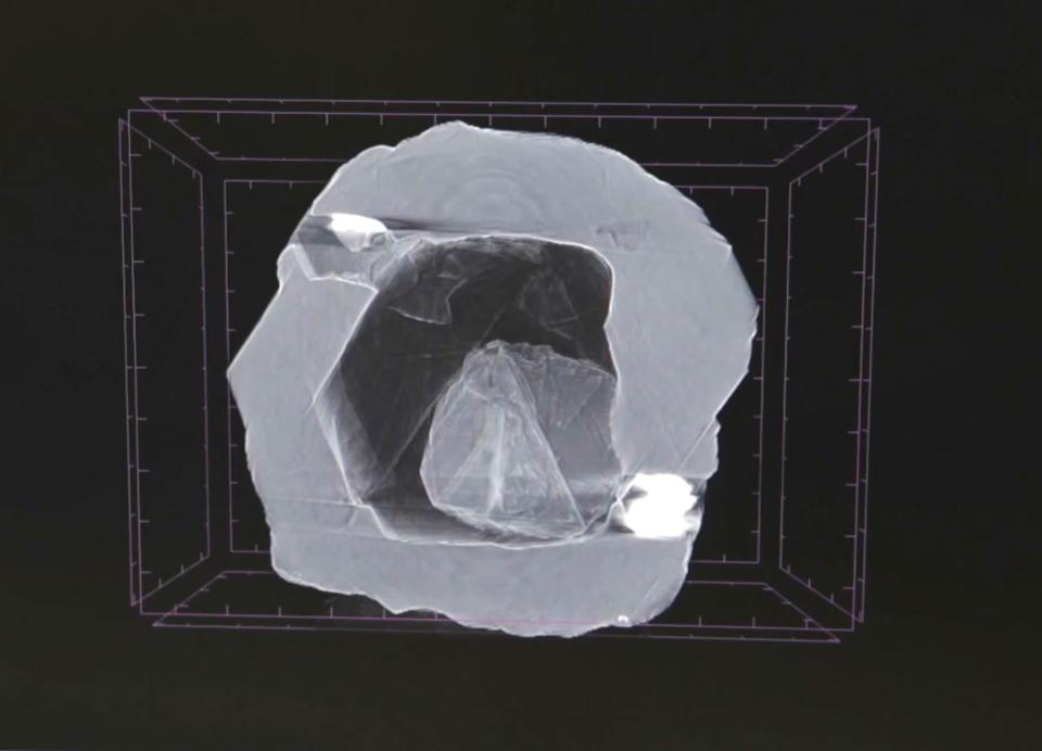 Większy, zewnętrzny kamień ma masę 0,62ct i wymiary 4,8x4,9x2,8mm, natomiast mniejszy, wewnętrzny – 0,02ct i wymiary 1,9x2,1x0,6mm. Przestrzeń wewnątrz kamienia „gospodarza” to zaledwie 6 mm sześciennych (poniżej zdjęcie rentgenowskie obydwu kamieni).