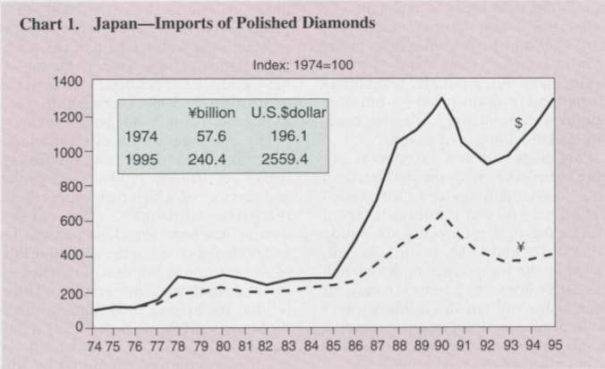 Lata 60-te XX wieku to okres wielkiego rozwoju technologii elektronicznej, a zatem kraju takiego jak Japonia. Oczywiście tam gdzie pojawiają się duże pieniądze i dochody, tam rozwija się rynek dóbr luksusowych, do których należą diamenty. Podobnie jak wcześniej w USA powstaje kampania promująca ideę diamentowego pierścionka zaręczynowego. Ma on być wyrazem nie tylko miłości, statusu społecznego, ale również chęci podążania za modnymi trendami społeczeństwa amerykańskiego. Poniższy wykres obrazuje wzrost importu szlifowanych diamentów do Japonii w latach 1974-1995.